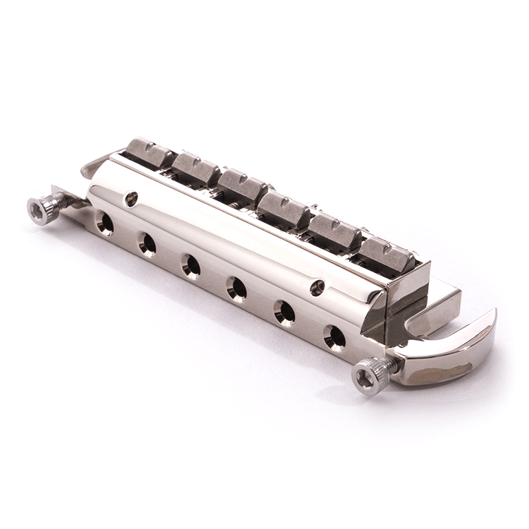 Schlichte und solide Wrap Around Konstruktion mit weitem Verstellbereich der Oktaven. Da der Bolzenabstand dieser Bridge 81.5mm beträgt, kann sie an Stelle einer klassischen Wrap-Around Brücke montiert werden.