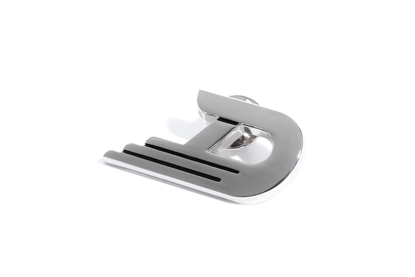 Ein D-Logo Pin aus Metall, High-Polish Nickel