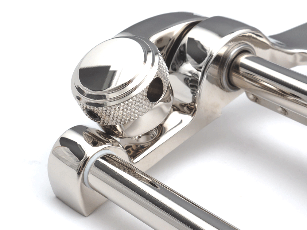 Bester Sound bei geringem Gewicht durch gegossenes Alu-Gehäuse, wunderbar weiche Gängigkeit bei höchster Stimmstabilität durch High Tech Achslager. Der Hebel ist um 360° drehbar und in Länge und Winkel auf Deine Wünsche einstellbar. Die Saiten werden beim Wechsel einfach in den fest verschraubten Lochbalken unterhalb der Achse eingefädelt und völlig stressfrei zu den Mechaniken geführt. Kein Verrutschen, kein Festhalten der Ball-Ends nötig.