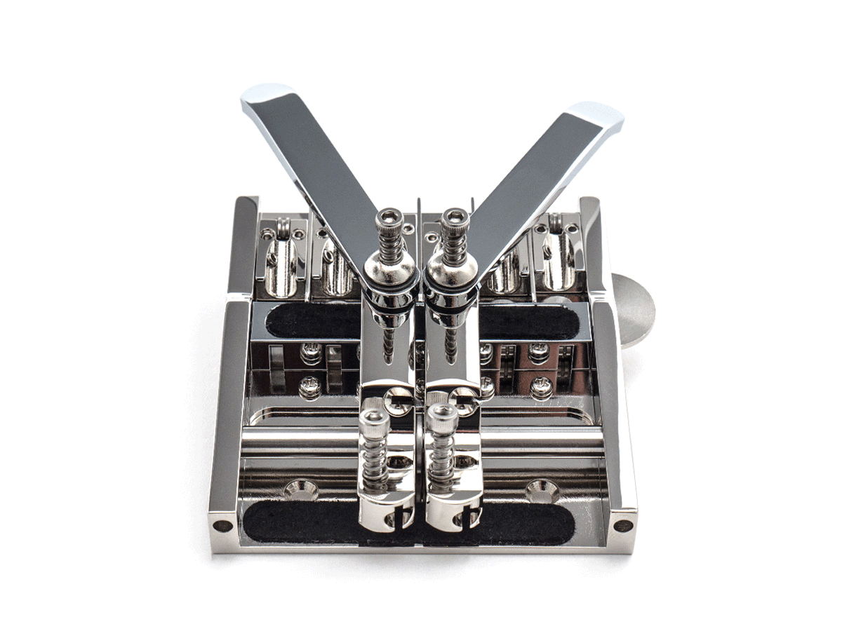 Hinter den individuell einstellbaren Saitenreitern und einer Umlenkrolle sitzen auf einer Achse zwei Hebel, die jeweils eine einzelne Saite um exakt einen oder zwei Halbtöne anheben oder absenken (je nachdem, wie die Saite eingehängt wurde). Wir richten die Hebel ab Werk für die G- und die H-Saite ein. Man kann die Hebel aber beliebig hinter jede Saite schieben. Auch lässt sich das System um weitere Hebel erweitern. Wir empfehlen allerdings, nicht mehr als drei Hebel zu montieren, da es sonst zu unhandlich wird. Aber wer's mag, kann es trotzdem tun.